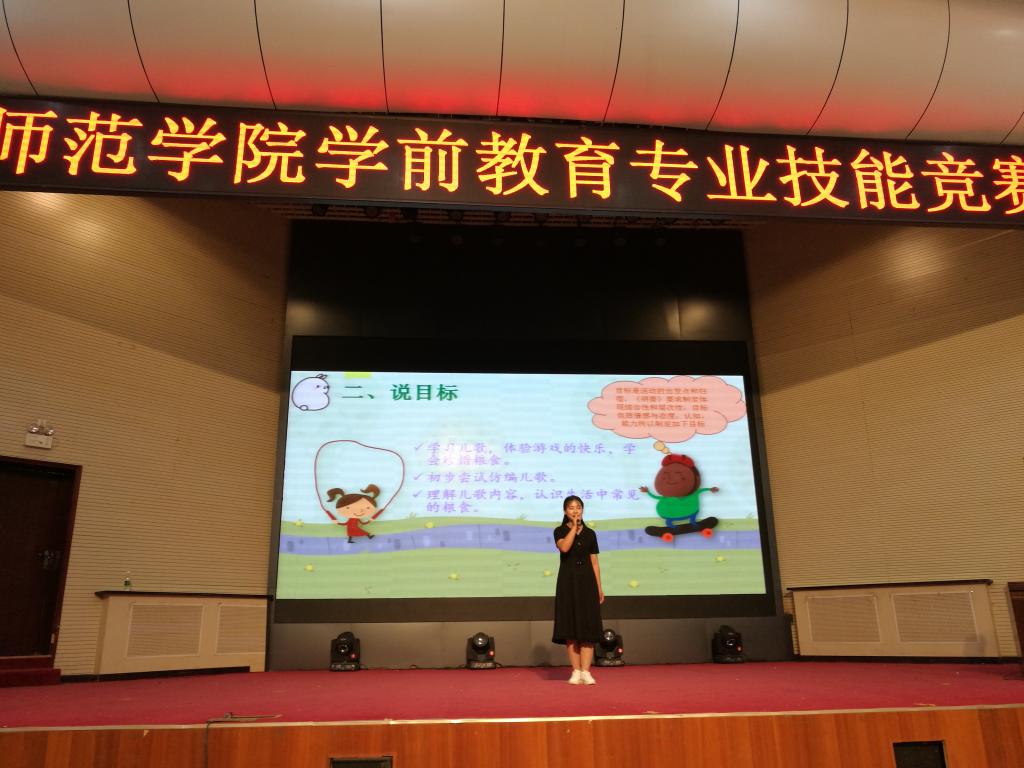 说课赛项采取选手现场说课、回答问题、评委当场打分方式,每位选手限时15钟。选手就课程内容从整体设计意图、活动目标、重难点、活动准备、教学方法手段、活动过程安排等进行演示讲解。比赛主要检测员工依据教学目标要求、教学内容和幼儿实际进行课堂教学的设计能力、组织能力以及讲、说、唱、演的表达能力。评委老师的提问紧扣所讲内容,对选手以及在场观看的员工起到进一步的启发和引导作用。