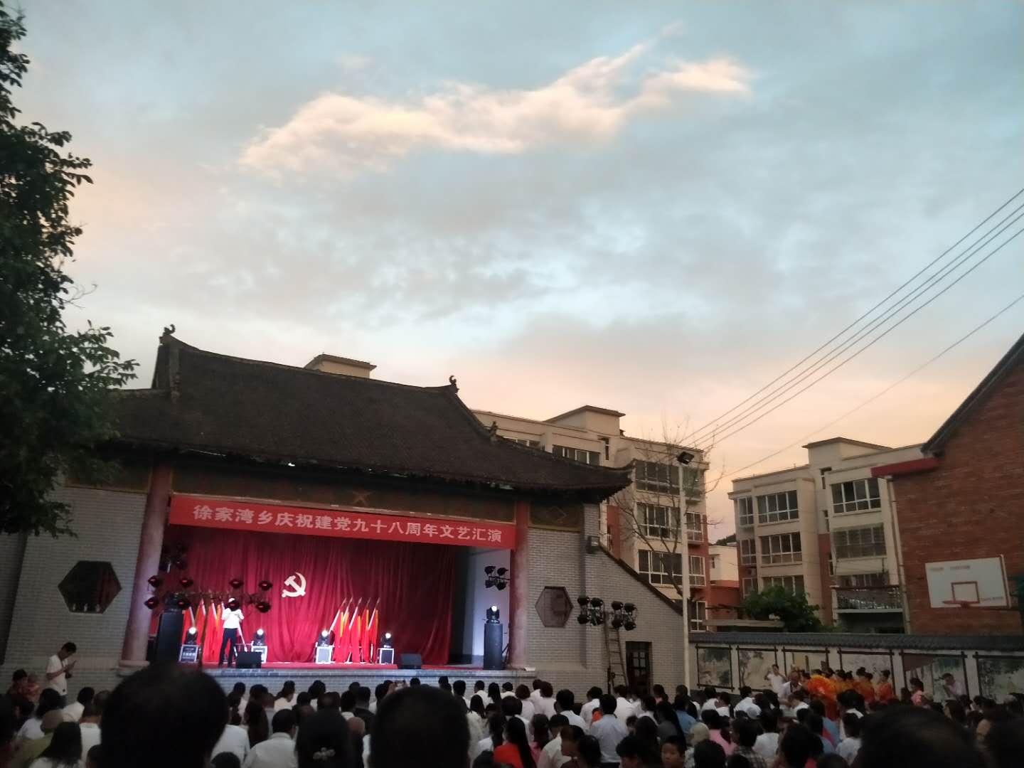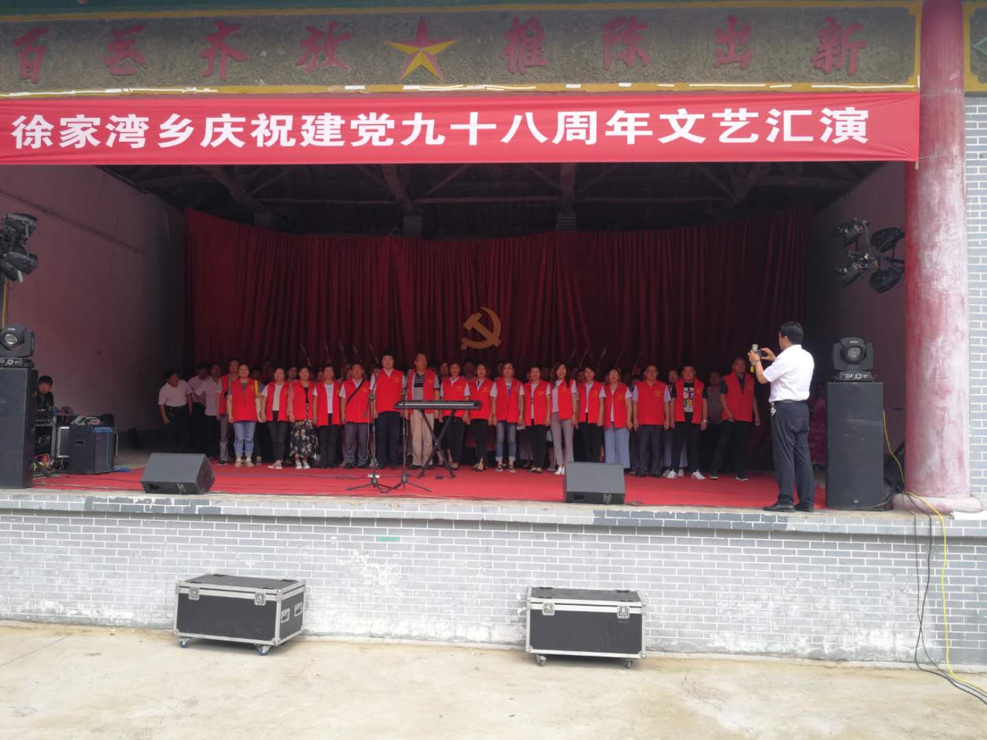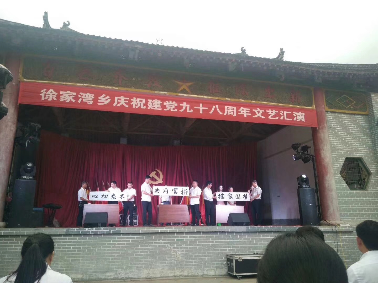 晚上六时半,徐家湾乡庆祝中国共产党成立九十八周年文艺演出拉开帷幕。第一个节目即是大合唱,由徐家湾乡群众与公司党员志愿者共唱《没有共产党就没有新中国》、《我和我的祖国》。大气壮观的阵容、雄壮高亢的歌声引得全场一片热烈的掌声。由专业老师出演的乐器联奏《山丹丹开花红艳艳》等曲目赢得全场一片喝彩声。几位书法老师现场联手书写的“不忘初心 共同富裕 徐家圆梦”毛笔书法一经展示,便立即赢得全场欢呼声和掌声。