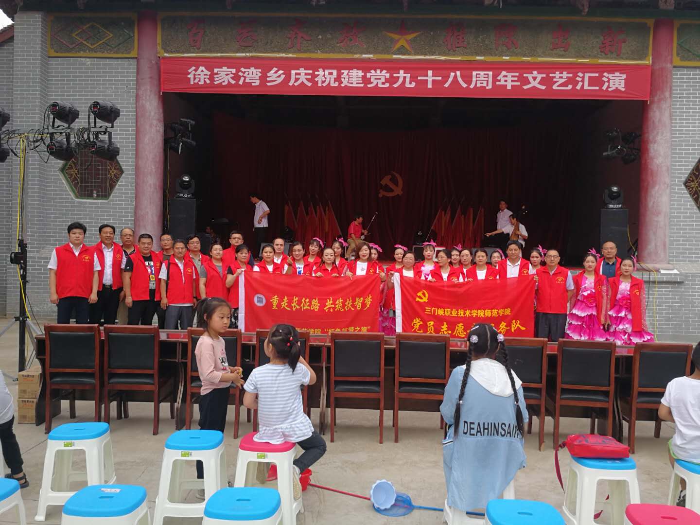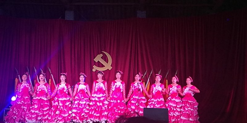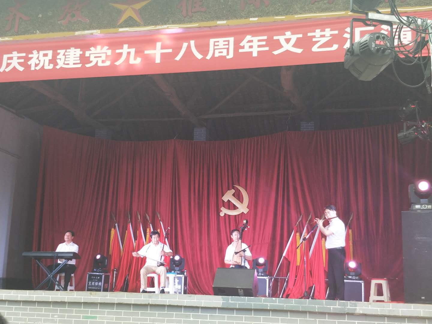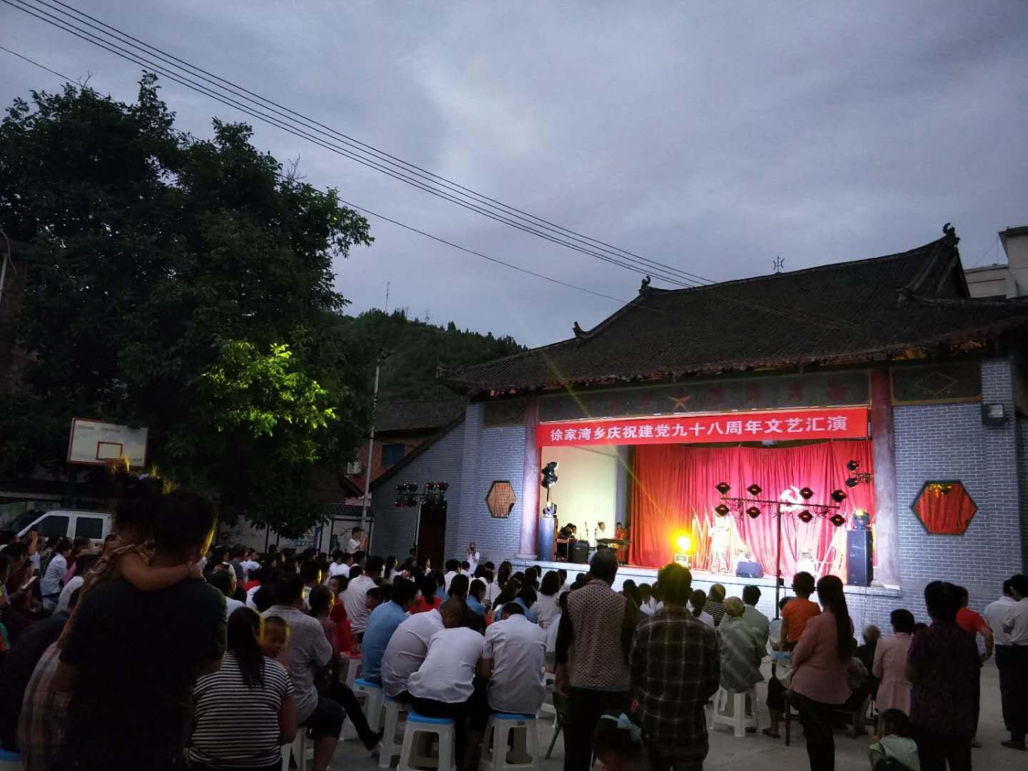 晚上六时半,徐家湾乡庆祝中国共产党成立九十八周年文艺演出拉开帷幕。第一个节目即是大合唱,由徐家湾乡群众与公司党员志愿者共唱《没有共产党就没有新中国》、《我和我的祖国》。大气壮观的阵容、雄壮高亢的歌声引得全场一片热烈的掌声。由专业老师出演的乐器联奏《山丹丹开花红艳艳》等曲目赢得全场一片喝彩声。几位书法老师现场联手书写的“不忘初心 共同富裕 徐家圆梦”毛笔书法一经展示,便立即赢得全场欢呼声和掌声。